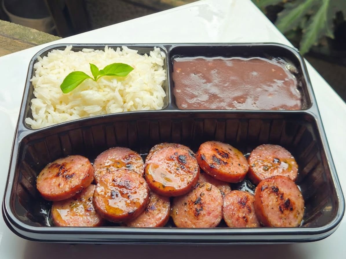 Escolha 2 opções entre: Arroz branco soltinho, Feijão preto de caldo temperado, Purê de Batatas Cremoso, Batata assada com especiarias, Batata palha Amarelinha ou Farofa refogada da casa com Bacon + Saborosa Calabresa Grelhada. Ingredientes Frescos de Qualidade & Temperos e 100% Naturais.