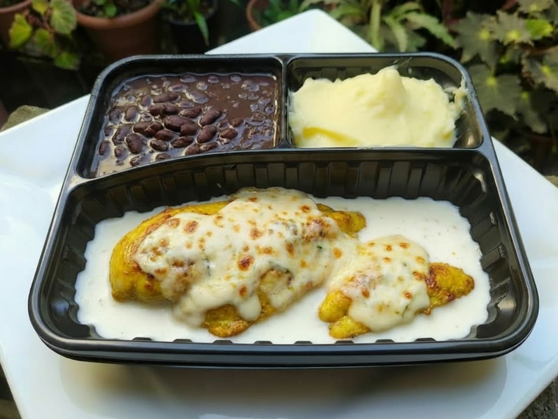 Escolha 2 opções entre: Arroz branco soltinho, Feijão preto de caldo temperado, Purê de Batatas Cremoso, Batata assada com especiarias, Batata palha Amarelinha ou Farofa refogada da casa com Bacon + Divino Filé de Frango Grelhado + molho branco com Queijos. Ingredientes Frescos de Qualidade & Temperos e 100% Naturais.