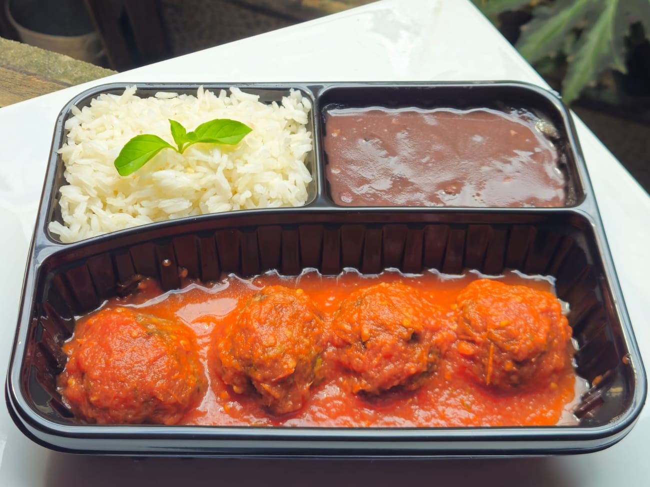 Escolha 2 opções entre: Arroz branco soltinho, Feijão preto de caldo temperado, Purê de Batatas Cremoso, Batata assada com especiarias, Batata palha Amarelinha ou Farofa refogada da casa com Bacon + Incríveis almondegas ao molho vermelho natural de tomates. Ingredientes Frescos de Qualidade & Temperos e 100% Naturais.