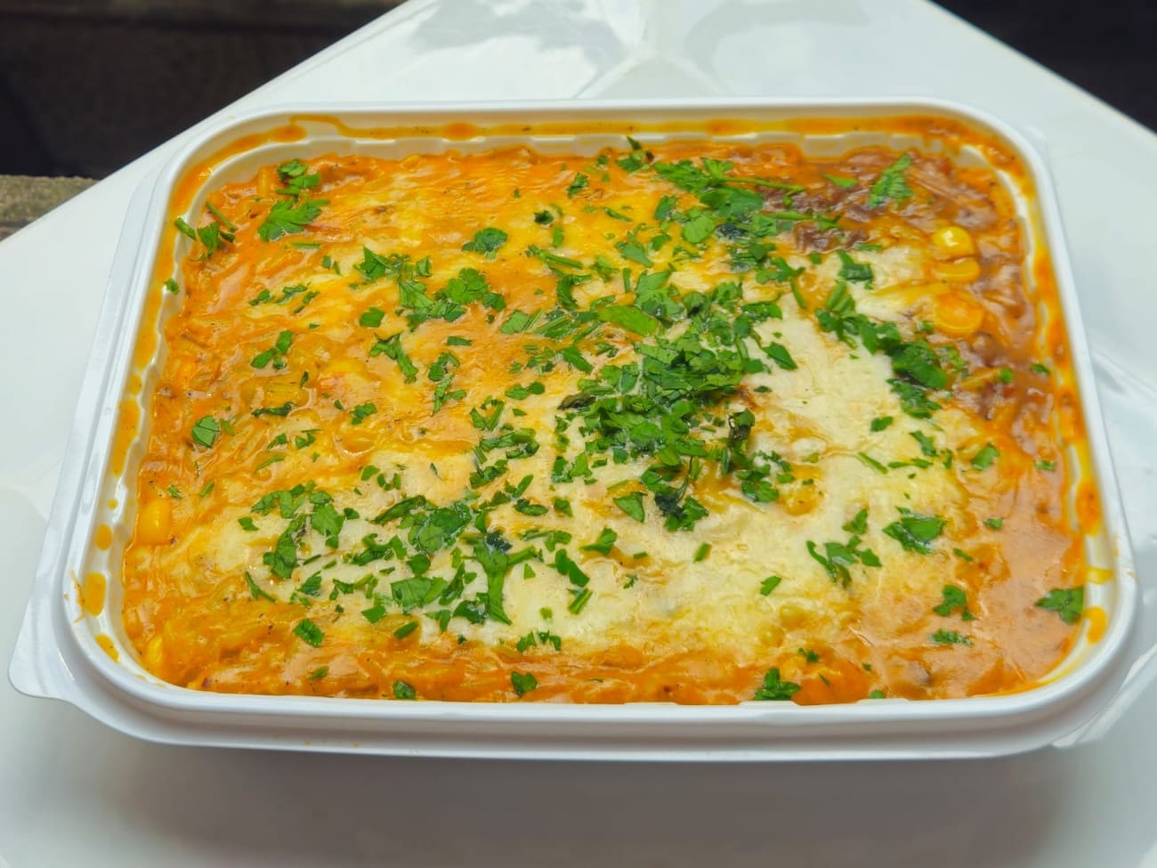 Deliciosa Carne de Panela desfiada, combinada com Arroz saboroso ao Molho branco à base de creme de leite & Molho vermelho Natural de tomates com Queijos provolone & muçarela, milho e tempero verde. Preparado com Ingredientes Frescos de Qualidade. Temperos & Especiarias 100% Naturais
