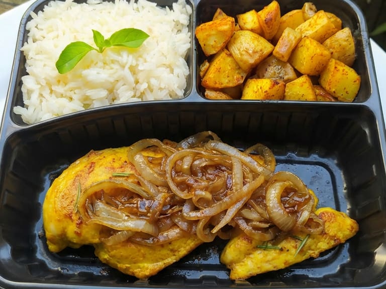 Escolha 2 opções entre: Arroz branco soltinho, Feijão preto de caldo temperado, Purê de Batatas Cremoso, Batata assada com especiarias, Batata palha Amarelinha ou Farofa refogada da casa com Bacon + Delicioso Filé de Frango Grelhado & Acebolado. Ingredientes Frescos de Qualidade & Temperos e 100% Naturais.