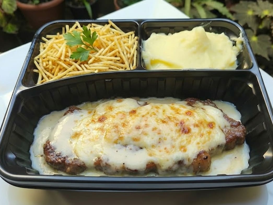 Escolha 2 opções entre: Arroz branco soltinho, Feijão preto de caldo temperado, Purê de Batatas Cremoso, Batata assada com especiarias, Batata palha Amarelinha ou Farofa refogada da casa com Bacon + Divino Filé de carne Alcatra Bovina Grelhado + molho branco com Queijos. Ingredientes Frescos de Qualidade & Temperos e 100% Naturais.