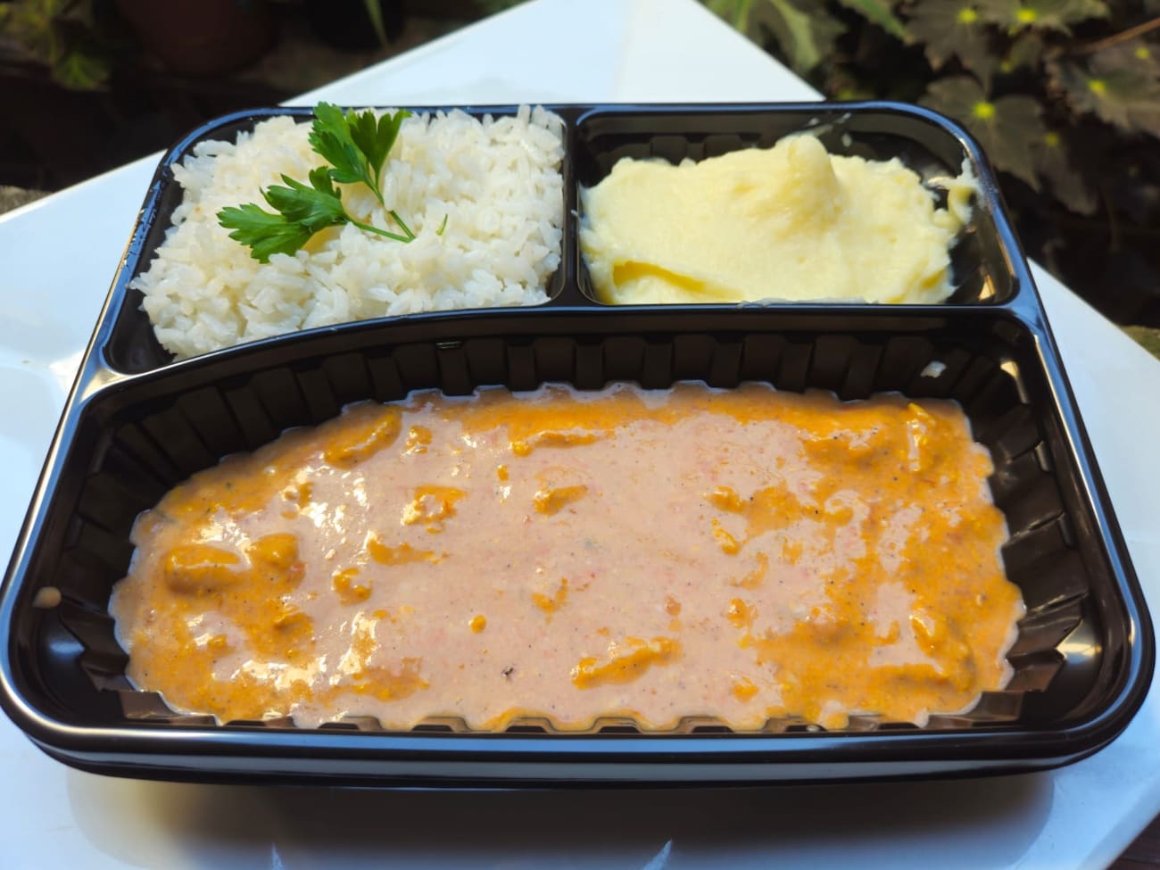 Escolha 2 opções entre: Arroz branco soltinho, Feijão preto de caldo temperado, Purê de Batatas Cremoso, Batata assada com especiarias, Batata palha Amarelinha ou Farofa refogada da casa com Bacon + Saboroso Estrogonofe de Frango. Ingredientes Frescos de Qualidade & Temperos e 100% Naturais.