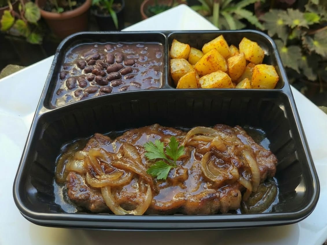 Escolha 2 opções entre: Arroz branco soltinho, Feijão preto de caldo temperado, Purê de Batatas Cremoso, Batata assada com especiarias, Batata palha Amarelinha ou Farofa refogada da casa com Bacon + Saboroso Filé de carne Alcatra Bovina Grelhado & Acebolado. Ingredientes Frescos de Qualidade & Temperos e 100% Naturais.