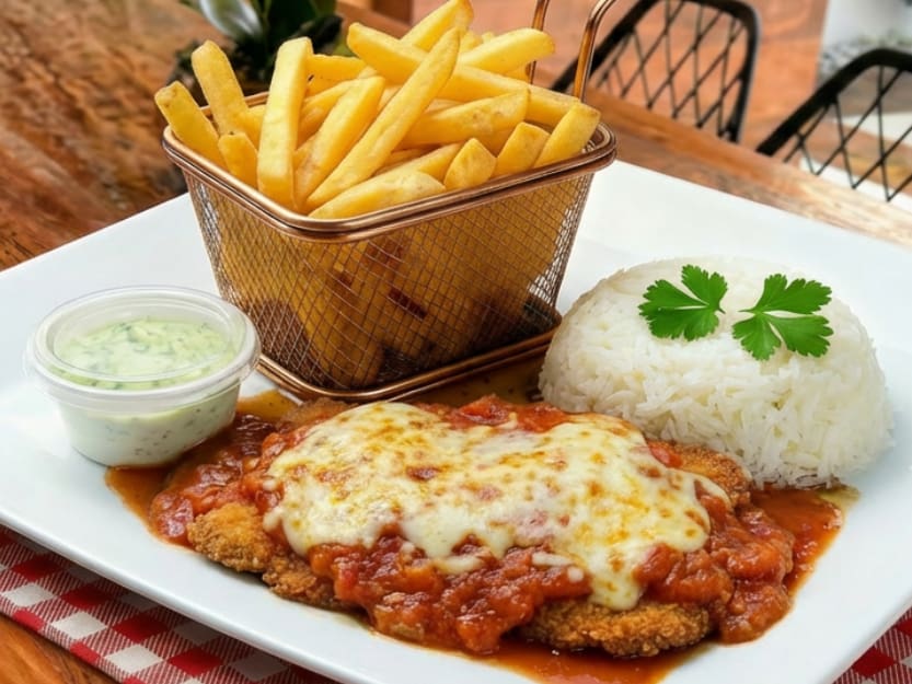 Arroz branco soltinho 230g + Batata frita Média 250g + maionese verde 30g + Saboroso Filé de Carne bovina 180g à Parmegiana ( filé empanado + Molho vermelho Natural & Queijos) preparado com Ingredientes Frescos de Qualidade. Temperos & Especiarias 100% Naturais.