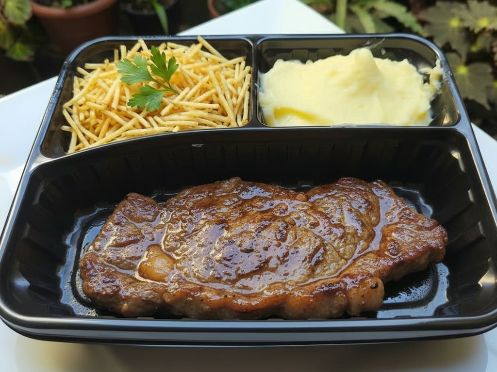 Escolha 2 opções entre: Arroz branco soltinho, Feijão preto de caldo temperado, Purê de Batatas Cremoso, Batata assada com especiarias, Batata palha Amarelinha ou Farofa refogada da casa com Bacon + Suculento Filé de carne de alcatra bovina Grelhada. Ingredientes Frescos de Qualidade & Ingredientes Frescos de Qualidade & Temperos e 100% Naturais.
