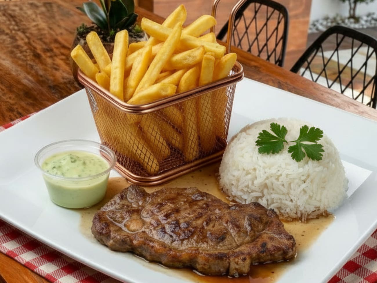 Arroz branco soltinho 230g + Saboroso Filé de Carne Alcatra bovina Grelhada 180g + Batata frita Média 250g + maionese verde 30g. Preparado com Ingredientes Frescos de Qualidade. Temperos & Especiarias 100% Naturais